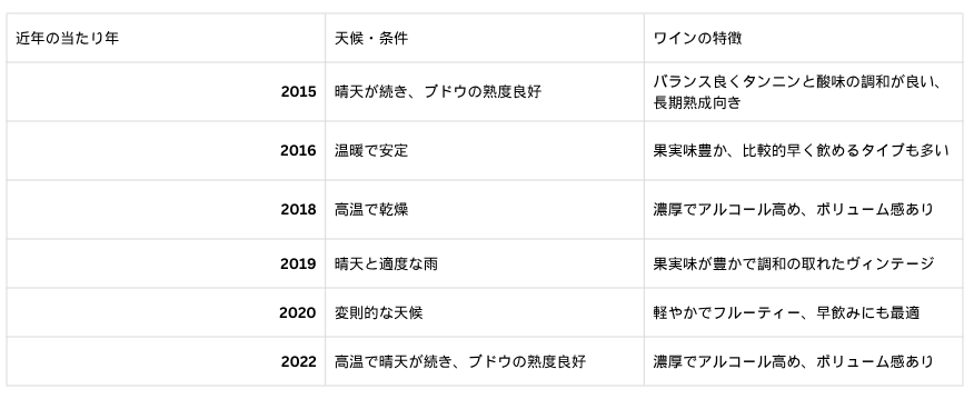 天候に恵まれた年に造られたワインは、ブドウの状態が良いため、熟成に適した素晴らしいワインに仕上がります。したがって、そのような年にできたワインは熟成に適しており、世界的評価が高く、高値で取引される事に。これが、当たり年にできたワインということです。下記、ここ10年間の当たり年を表にまとめました。