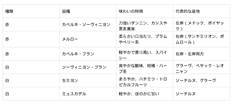 ボルドーワインに使用される主な品種のざっくりとした特徴をまとめてみました。